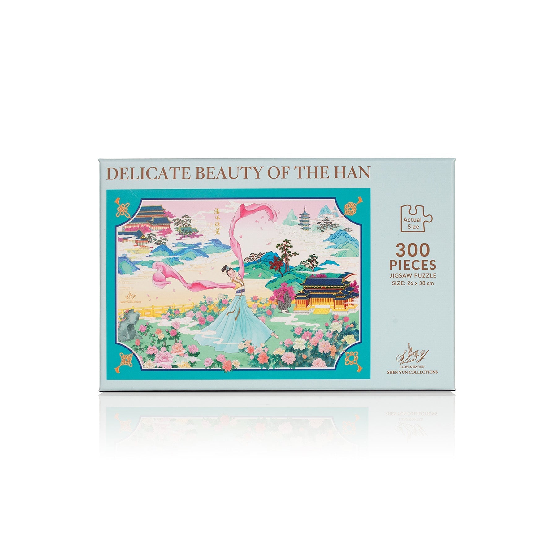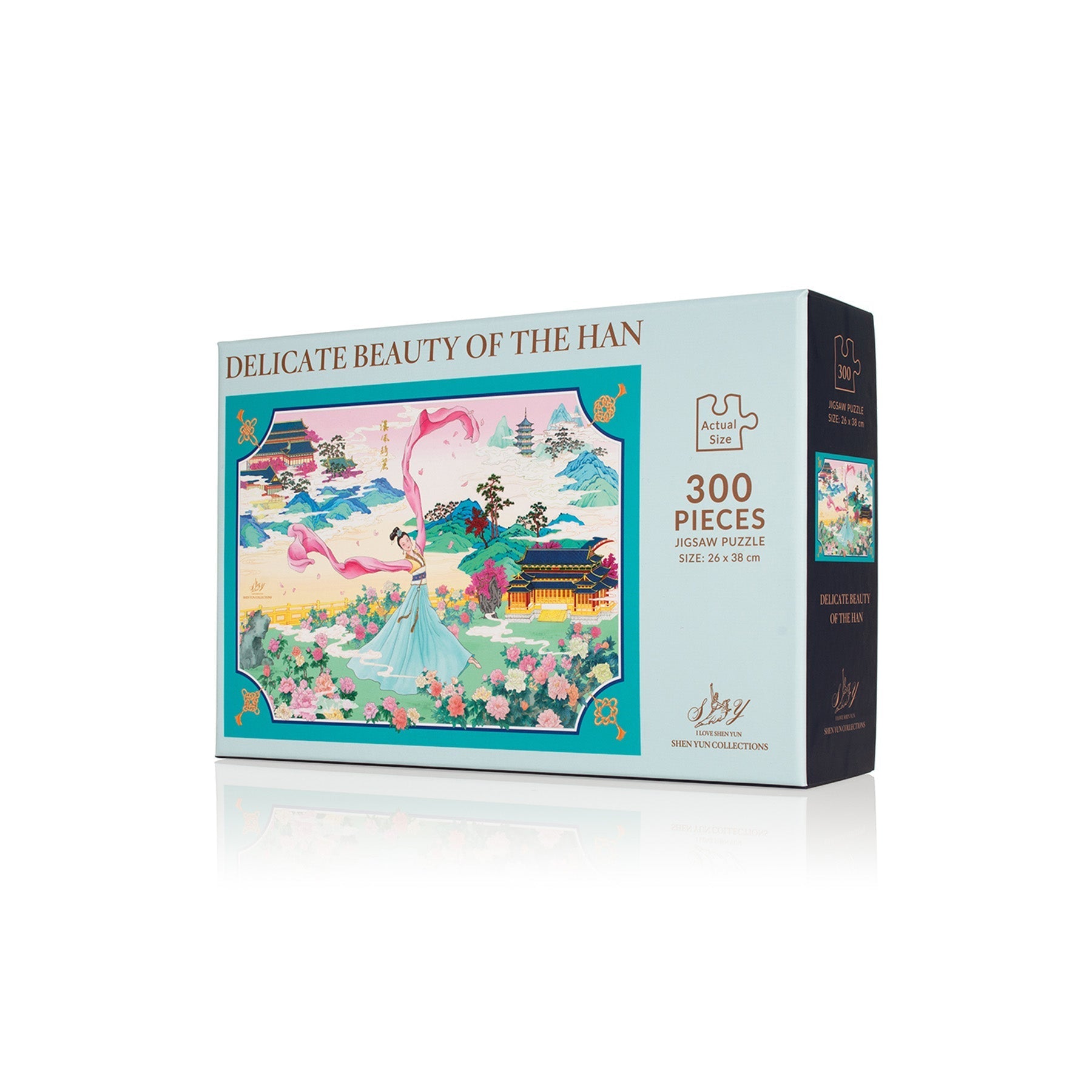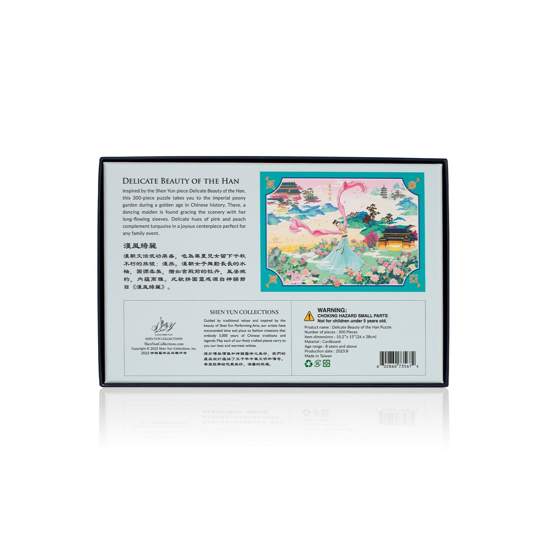 Inspired by the Shen Yun piece Delicate Beauty of the Han, this 300-piece puzzle takes you to the imperial peony garden during a Golden age in Chinese history. There, a dancing maiden is found gracing the scenery with her long-flowing sleeves. Delicate hues of pink and peach complement turquoise in a joyous centerpiece perfect for any family event.