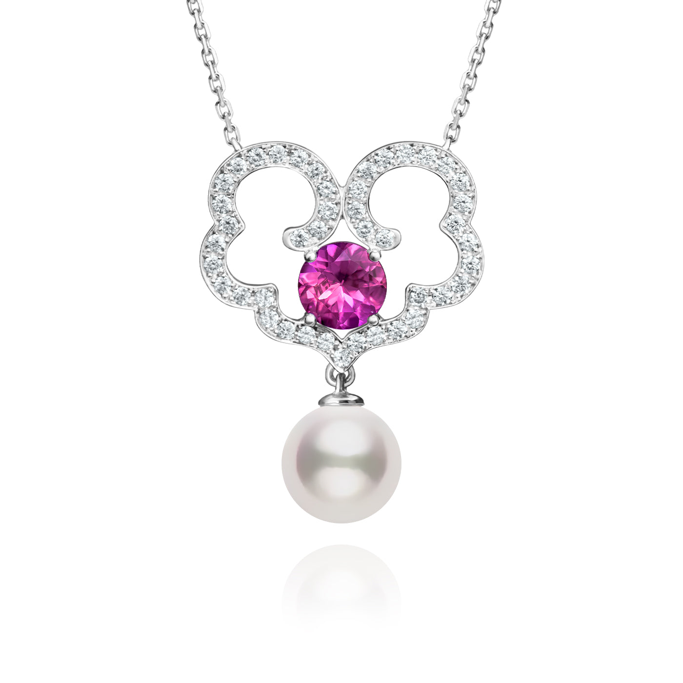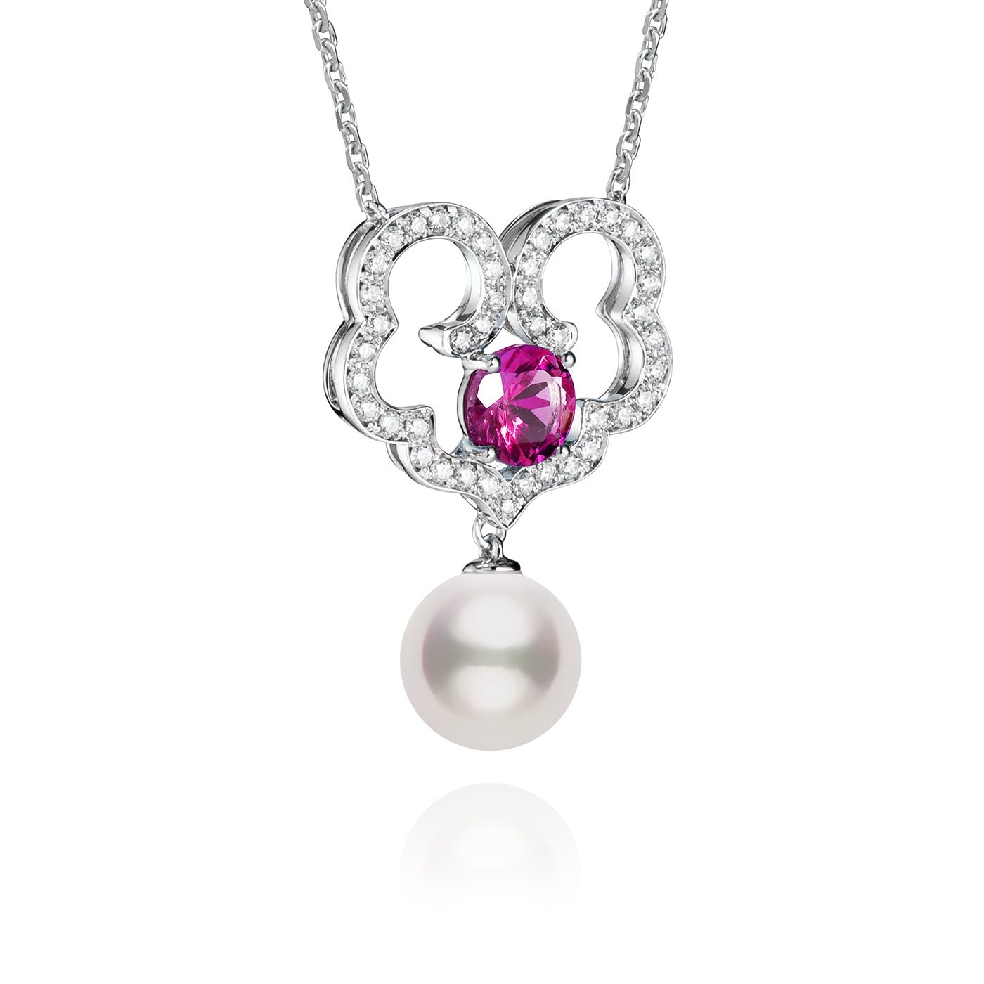 A timeless symbol that represents the realization of one’s wishes and a good future ahead, the blissful Ruyi motif rendered in 18k white gold is artfully adorned with a mesmerizing Rhodolite Garnet gemstone and a fine Akoya pearl in this collection of exquisite pieces.
